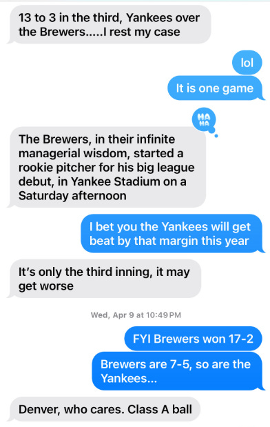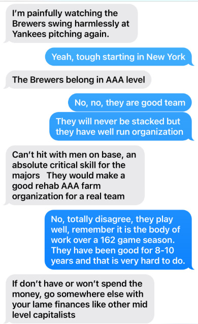 A text from a good friend when the Brewers were getting clobbered in the second game of the season: