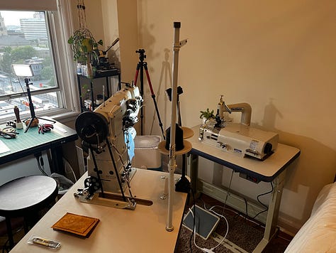 Over the weekend, I got both machines assembled and set up. The 2750 is a cylinder arm machine with a walking foot, built for stitching heavy materials like the leather I’m using for glove work. The SK-4 will be used to skive—thin down the edges of leather for binding and welting.