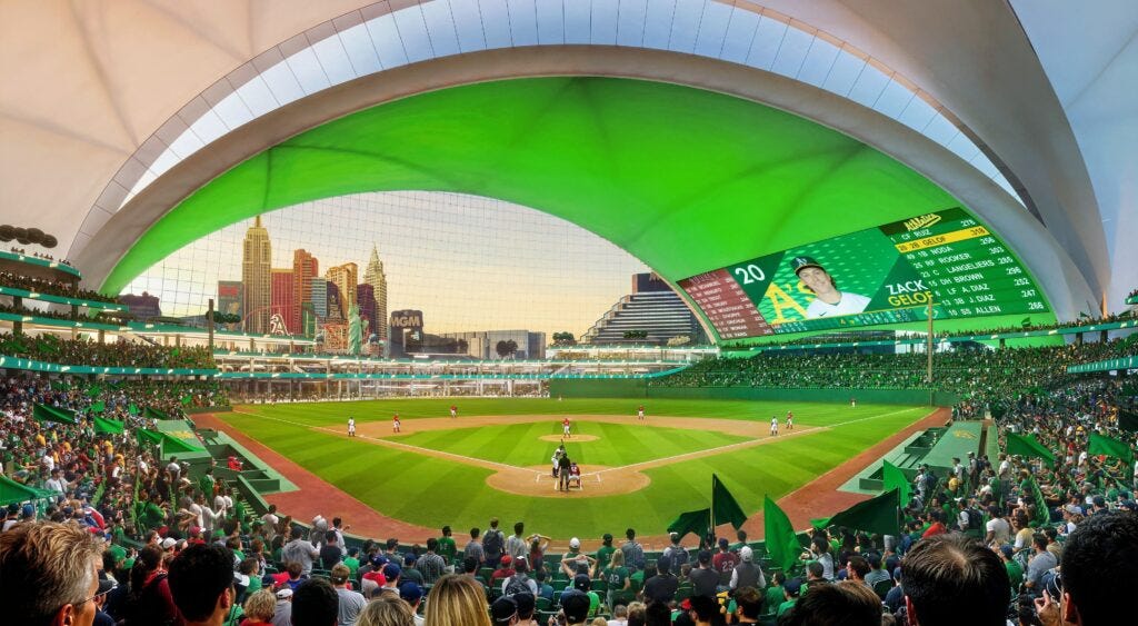 And then there’s the future. Las Vegas, home to the relocated A’s in 2028, is already designing its stadium like a visual spectacle, a domed, layered structure with an 18,000-square-foot video board and a view of the Strip. It's a sports venue that leans into Vegas’s most recognizable export: engineered immersion.
